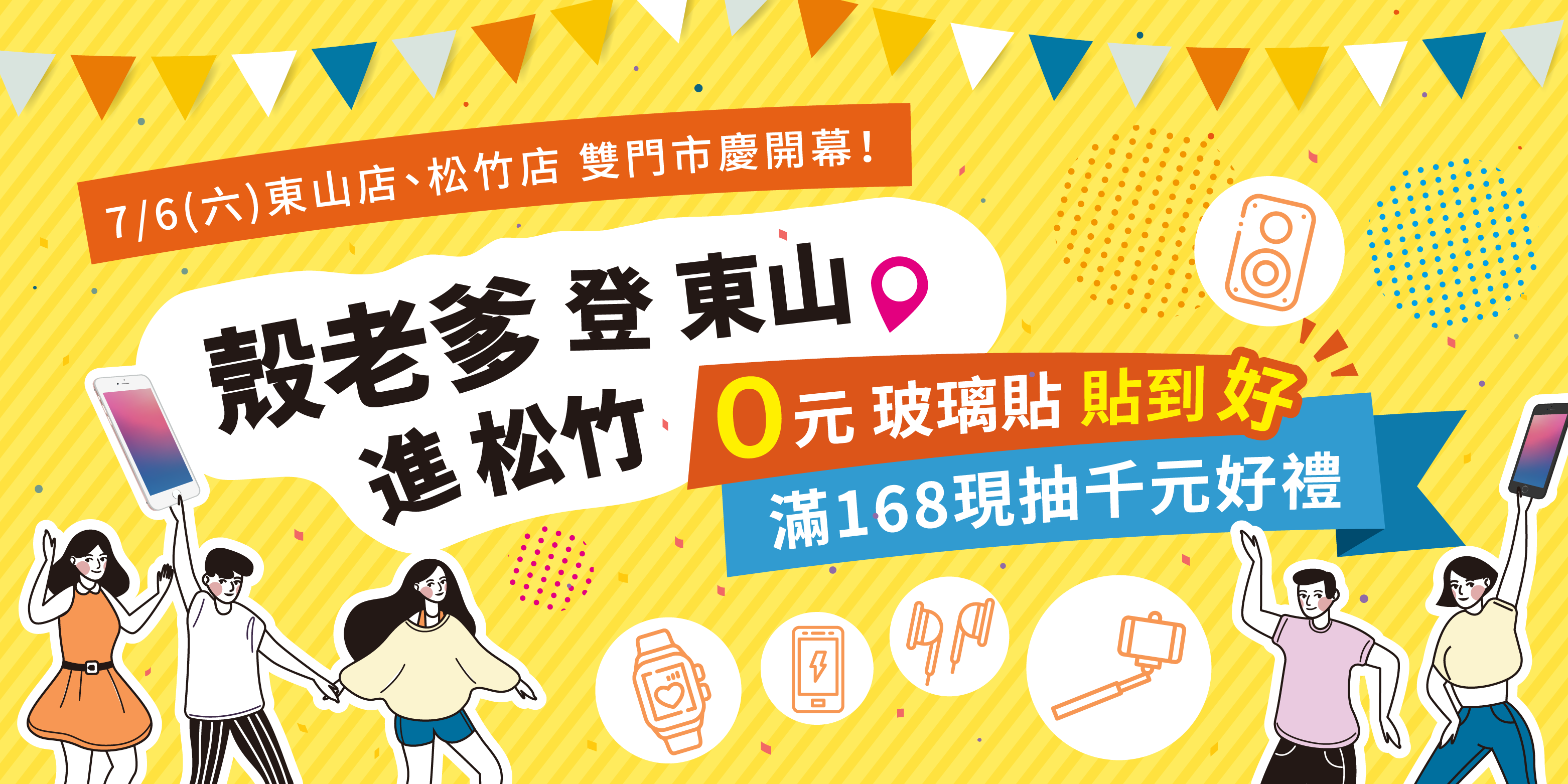 殼老爹7/6(六)、7/7(日)東山、松竹,雙門市開幕慶!要送你限量免費玻璃貼+貼到好服務,還有超值3C配件好禮讓你抽抽抽!快到殼老爹東山店、松竹店一起來享好康吧!